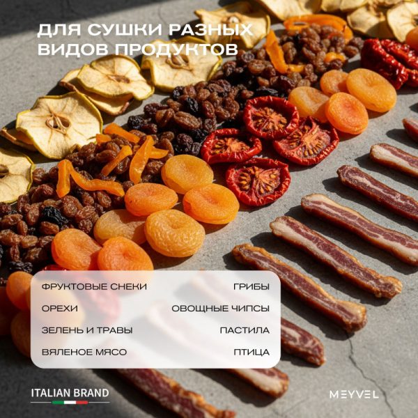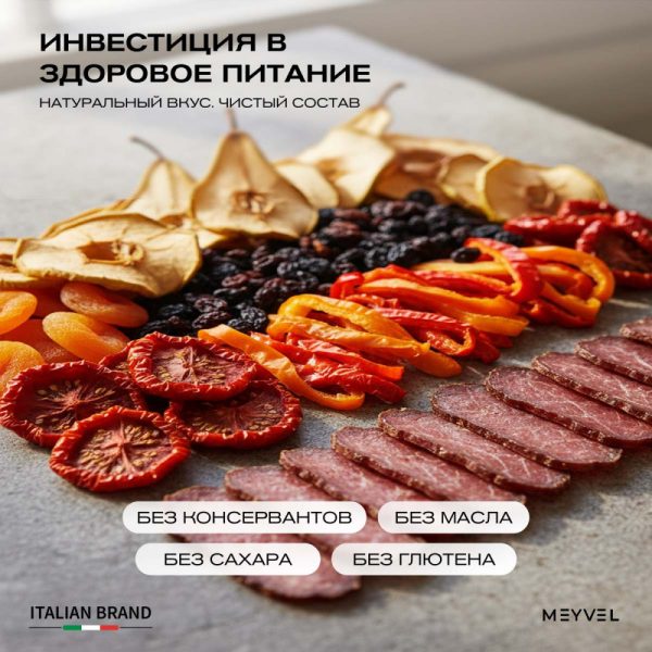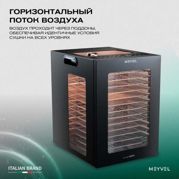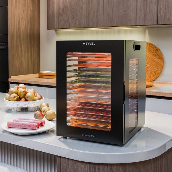 Meyvel MDH14-2S (Black) — это современный дегидратор, который создан для тех, кто хочет заготавливать фрукты, овощи, мясо, травы и ягоды без потери их вкуса и пользы круглый год. Прочный корпус, продуманная конструкция и умная электроника превращают его в надёжного помощника на каждый сезон.
