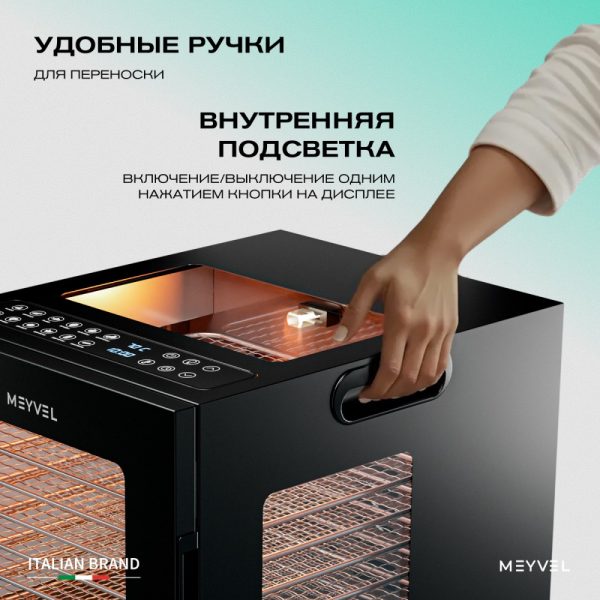 Meyvel MDH8-1S (Black) — это современный дегидратор, который создан для тех, кто хочет заготавливать фрукты, овощи, мясо, травы и ягоды без потери их вкуса и пользы круглый год. Прочный корпус, продуманная конструкция и умная электроника превращают его в надёжного помощника на каждый сезон.