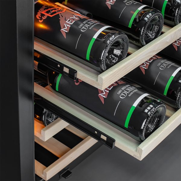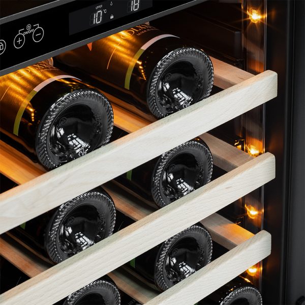 Компрессорный винный шкаф Meyvel MV46NH-KWT2 обладает большой вместимостью и способен разместить до 46 бутылок. Располагаются они на полках из массива бука. Внутреннее пространство шкафа разделено на 2 температурные зоны с возможностью настраивать каждую из них (верхняя зона имеет диапазон от +5℃ до +12℃, а нижняя – от +12℃ до +20℃). Холодильник поддерживает влажность в диапазоне 60-80%, как в настоящем винном погребе.