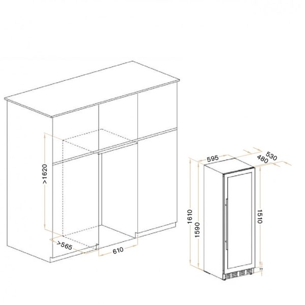 Этот винный холодильник отлично впишется в любой кухонный гарнитур благодаря своим размерам. Это одна из немногих моделей, у которой глубина не превышает глубину кухонной столешницы. Поэтому при установке он не будет выступать за габариты столешницы. (глубина стандартной столешницы 600 мм / глубина винного шкафа 530 мм) .